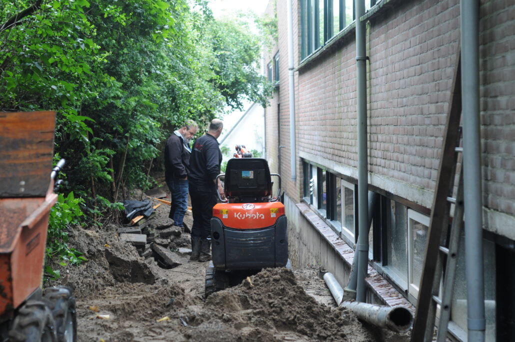 Begin deze week arriveerden de werknemers van het grondverzet bedrijf. Zij zijn begonnen met het uitgraven van een lange sleuf rond ons gebouw op de Liendertseweg.